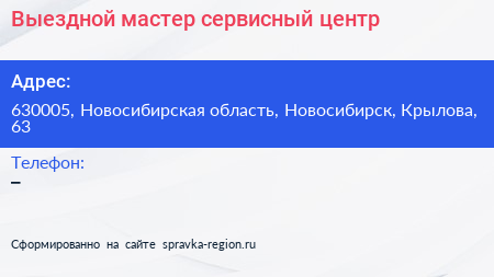 Выездной мастер, сервисный центр по адресу 630005, Новосибирская область, Новосибирск, Крылова, 63 в дальнейшем Организация, размещена в следующих категориях: