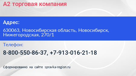 А2, торговая компания по адресу 630063, Новосибирская область, Новосибирск, Нижегородская, 270/1 в дальнейшем Организация, размещена в следующих категориях: