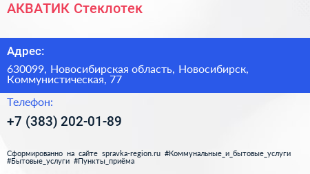 АКВАТИК, Стеклотек по адресу 630099, Новосибирская область, Новосибирск, Коммунистическая, 77 в дальнейшем Организация, размещена в следующих категориях: