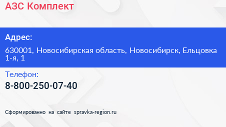 АЗС Комплект по адресу 630001, Новосибирская область, Новосибирск, Ельцовка 1-я, 1 в дальнейшем Организация, размещена в следующих категориях: