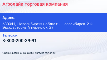 Агролайк, торговая компания по адресу 630041, Новосибирская область, Новосибирск, 2-й Экскаваторный переулок, 29 в дальнейшем Организация, размещена в следующих категориях: