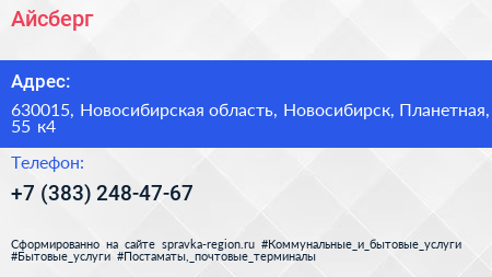 Айсберг по адресу 630015, Новосибирская область, Новосибирск, Планетная, 55 к4 в дальнейшем Организация, размещена в следующих категориях: