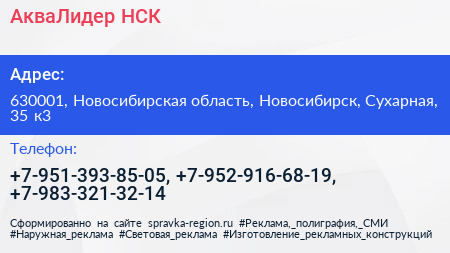 АкваЛидер НСК по адресу 630001, Новосибирская область, Новосибирск, Сухарная, 35 к3 в дальнейшем Организация, размещена в следующих категориях:
