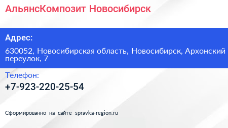 АльянсКомпозит Новосибирск по адресу 630052, Новосибирская область, Новосибирск, Архонский переулок, 7 в дальнейшем Организация, размещена в следующих категориях: