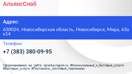АльянсСнаб по адресу 630024, Новосибирская область, Новосибирск, Мира, 63а к14 в дальнейшем Организация, размещена в следующих категориях: