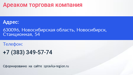 Ареаком, торговая компания по адресу 630096, Новосибирская область, Новосибирск, Станционная, 54 в дальнейшем Организация, размещена в следующих категориях: