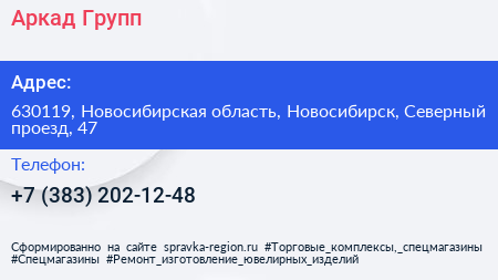 Аркад-Групп по адресу 630119, Новосибирская область, Новосибирск, Северный проезд, 47 в дальнейшем Организация, размещена в следующих категориях: