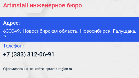 Artinstall, инженерное бюро по адресу 630049, Новосибирская область, Новосибирск, Галущака, 5 в дальнейшем Организация, размещена в следующих категориях: