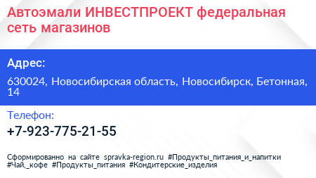 Автоэмали-ИНВЕСТПРОЕКТ, федеральная сеть магазинов по адресу 630024, Новосибирская область, Новосибирск, Бетонная, 14 в дальнейшем Организация, размещена в следующих категориях:
