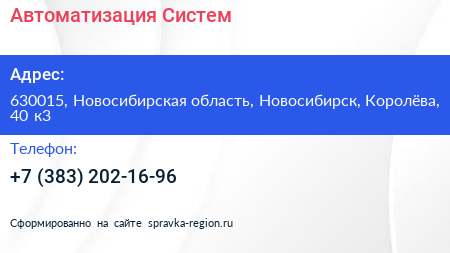Автоматизация Систем по адресу 630015, Новосибирская область, Новосибирск, Королёва, 40 к3 в дальнейшем Организация, размещена в следующих категориях: