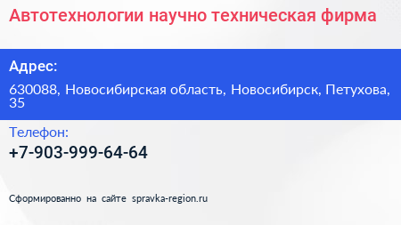 Автотехнологии, научно-техническая фирма по адресу 630088, Новосибирская область, Новосибирск, Петухова, 35 в дальнейшем Организация, размещена в следующих категориях: