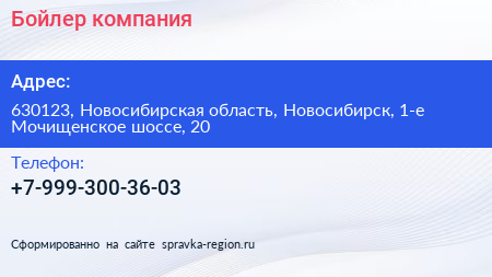 Бойлер, компания по адресу 630123, Новосибирская область, Новосибирск, 1-е Мочищенское шоссе, 20 в дальнейшем Организация, размещена в следующих категориях: