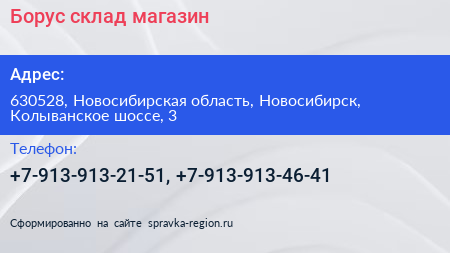 Борус, склад-магазин по адресу 630528, Новосибирская область, Новосибирск, Колыванское шоссе, 3 в дальнейшем Организация, размещена в следующих категориях: