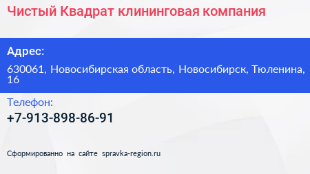 Чистый Квадрат, клининговая компания по адресу 630061, Новосибирская область, Новосибирск, Тюленина, 16 в дальнейшем Организация, размещена в следующих категориях: