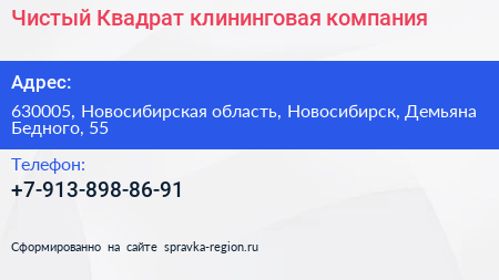 Чистый Квадрат, клининговая компания по адресу 630005, Новосибирская область, Новосибирск, Демьяна Бедного, 55 в дальнейшем Организация, размещена в следующих категориях: