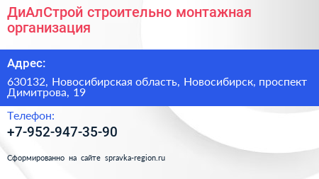 ДиАлСтрой, строительно-монтажная организация по адресу 630132, Новосибирская область, Новосибирск, проспект Димитрова, 19 в дальнейшем Организация, размещена в следующих категориях: