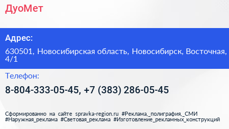 ДуоМет по адресу 630501, Новосибирская область, Новосибирск, Восточная, 4/1 в дальнейшем Организация, размещена в следующих категориях: