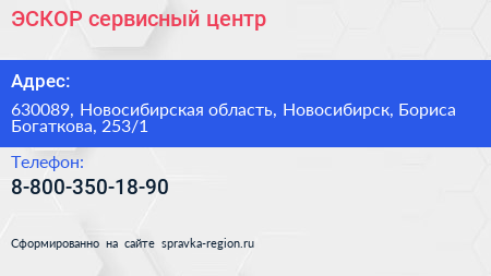 ЭСКОР, сервисный центр по адресу 630089, Новосибирская область, Новосибирск, Бориса Богаткова, 253/1 в дальнейшем Организация, размещена в следующих категориях: