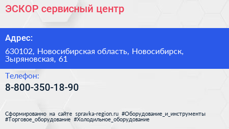 ЭСКОР, сервисный центр по адресу 630102, Новосибирская область, Новосибирск, Зыряновская, 61 в дальнейшем Организация, размещена в следующих категориях: