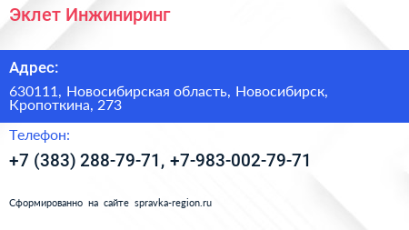 Эклет Инжиниринг по адресу 630111, Новосибирская область, Новосибирск, Кропоткина, 273 в дальнейшем Организация, размещена в следующих категориях: