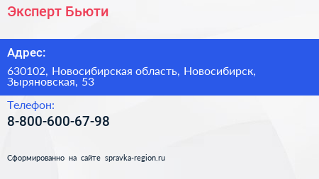 Эксперт Бьюти по адресу 630102, Новосибирская область, Новосибирск, Зыряновская, 53 в дальнейшем Организация, размещена в следующих категориях: