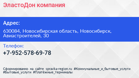 ЭластоДон, компания по адресу 630084, Новосибирская область, Новосибирск, Авиастроителей, 30 в дальнейшем Организация, размещена в следующих категориях: