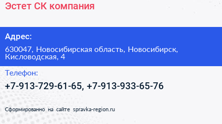 Эстет СК, компания по адресу 630047, Новосибирская область, Новосибирск, Кисловодская, 4 в дальнейшем Организация, размещена в следующих категориях: