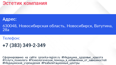 Эстетик, компания по адресу 630048, Новосибирская область, Новосибирск, Ватутина, 28а в дальнейшем Организация, размещена в следующих категориях: