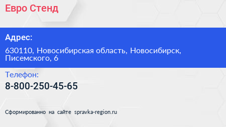 Евро Стенд по адресу 630110, Новосибирская область, Новосибирск, Писемского, 6 в дальнейшем Организация, размещена в следующих категориях: