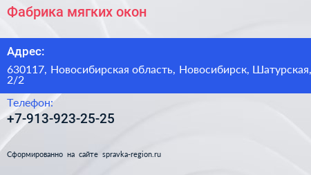 Фабрика мягких окон по адресу 630117, Новосибирская область, Новосибирск, Шатурская, 2/2 в дальнейшем Организация, размещена в следующих категориях: