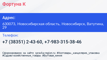 Фортуна-К по адресу 630073, Новосибирская область, Новосибирск, Ватутина, 29 в дальнейшем Организация, размещена в следующих категориях: