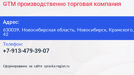 GTM, производственно-торговая компания по адресу 630039, Новосибирская область, Новосибирск, Крамского, 42 в дальнейшем Организация, размещена в следующих категориях:
