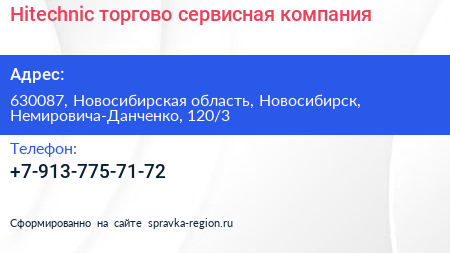 Hitechnic, торгово-сервисная компания по адресу 630087, Новосибирская область, Новосибирск, Немировича-Данченко, 120/3 в дальнейшем Организация, размещена в следующих категориях: