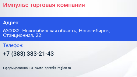 Импульс, торговая компания по адресу 630032, Новосибирская область, Новосибирск, Станционная, 22 в дальнейшем Организация, размещена в следующих категориях: