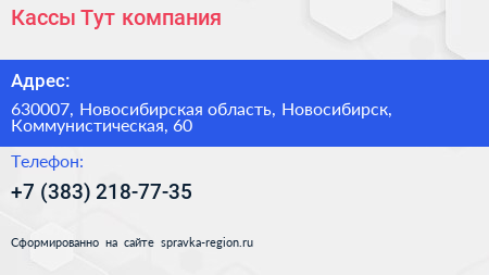 Кассы Тут, компания по адресу 630007, Новосибирская область, Новосибирск, Коммунистическая, 60 в дальнейшем Организация, размещена в следующих категориях: