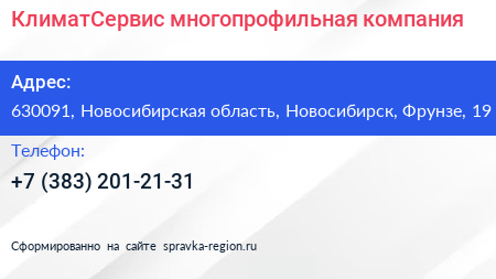 КлиматСервис, многопрофильная компания по адресу 630091, Новосибирская область, Новосибирск, Фрунзе, 19 в дальнейшем Организация, размещена в следующих категориях: