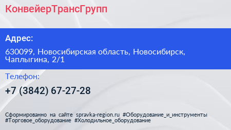 КонвейерТрансГрупп по адресу 630099, Новосибирская область, Новосибирск, Чаплыгина, 2/1 в дальнейшем Организация, размещена в следующих категориях: