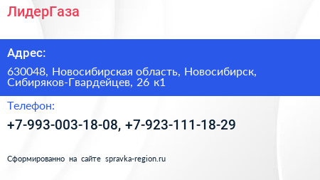 ЛидерГаза по адресу 630048, Новосибирская область, Новосибирск, Сибиряков-Гвардейцев, 26 к1 в дальнейшем Организация, размещена в следующих категориях: