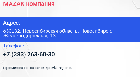 MAZAK, компания по адресу 630132, Новосибирская область, Новосибирск, Железнодорожная, 13 в дальнейшем Организация, размещена в следующих категориях: