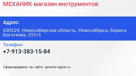 МЕХАНИК, магазин инструментов по адресу 630124, Новосибирская область, Новосибирск, Бориса Богаткова, 255/1 в дальнейшем Организация, размещена в следующих категориях: