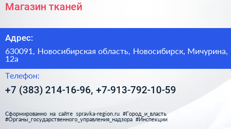 Магазин тканей по адресу 630091, Новосибирская область, Новосибирск, Мичурина, 12а в дальнейшем Организация, размещена в следующих категориях: