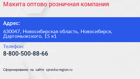 Макита, оптово-розничная компания по адресу 630047, Новосибирская область, Новосибирск, Даргомыжского, 15 к1 в дальнейшем Организация, размещена в следующих категориях: