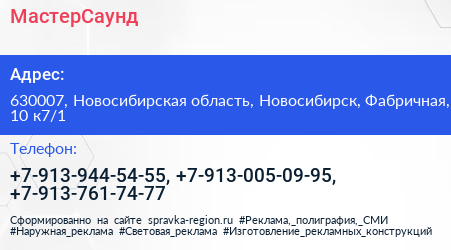 МастерСаунд по адресу 630007, Новосибирская область, Новосибирск, Фабричная, 10 к7/1 в дальнейшем Организация, размещена в следующих категориях: