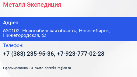 Металл Экспедиция по адресу 630102, Новосибирская область, Новосибирск, Нижегородская, 6а в дальнейшем Организация, размещена в следующих категориях: