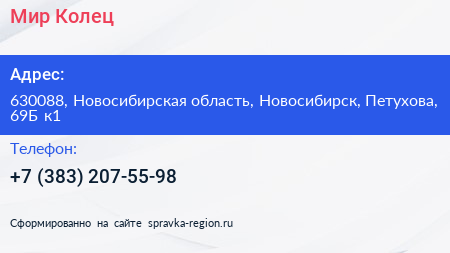 Мир Колец по адресу 630088, Новосибирская область, Новосибирск, Петухова, 69Б к1 в дальнейшем Организация, размещена в следующих категориях: