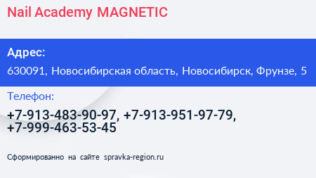 Nail Academy MAGNETIC по адресу 630091, Новосибирская область, Новосибирск, Фрунзе, 5 в дальнейшем Организация, размещена в следующих категориях: