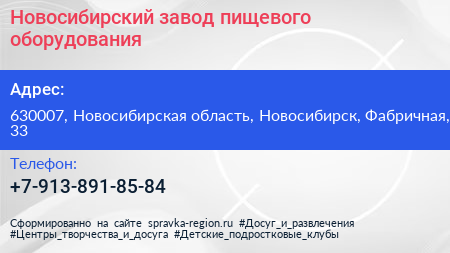 Новосибирский завод пищевого оборудования по адресу 630007, Новосибирская область, Новосибирск, Фабричная, 33 в дальнейшем Организация, размещена в следующих категориях: