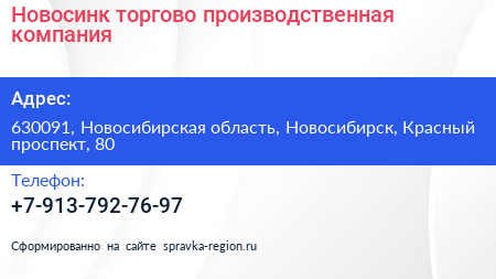 Новосинк, торгово-производственная компания по адресу 630091, Новосибирская область, Новосибирск, Красный проспект, 80 в дальнейшем Организация, размещена в следующих категориях: