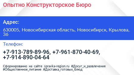 Опытно-Конструкторское Бюро по адресу 630005, Новосибирская область, Новосибирск, Крылова, 36 в дальнейшем Организация, размещена в следующих категориях: