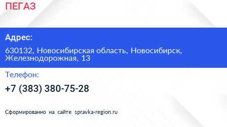 ПЕГАЗ по адресу 630132, Новосибирская область, Новосибирск, Железнодорожная, 13 в дальнейшем Организация, размещена в следующих категориях: